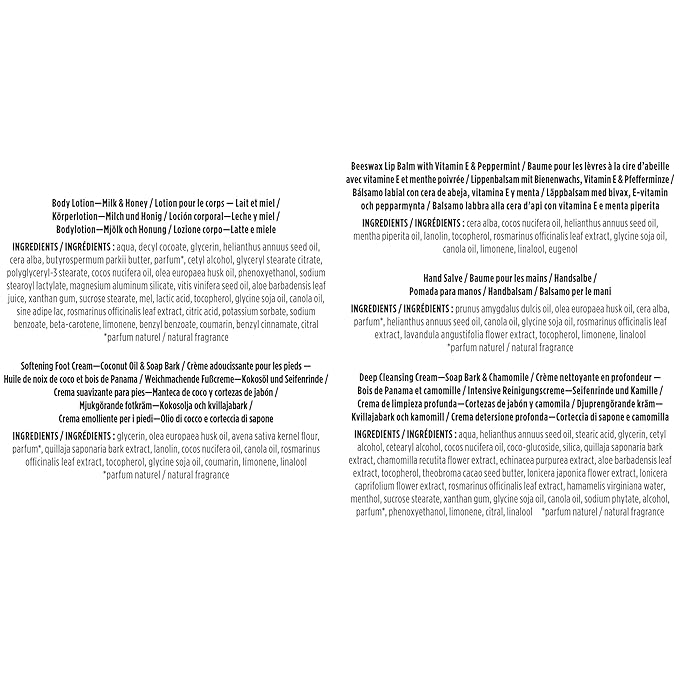 - ESSENTIAL KIT: Each kit contains one 0.75 oz. Softening Foot Cream, one 1 oz. Milk and Honey Body Lotion, one 0.3 oz. Hand Salve, one 0.75 oz. Deep Cleansing Cream and 0.15 oz. Beeswax Lip Balm