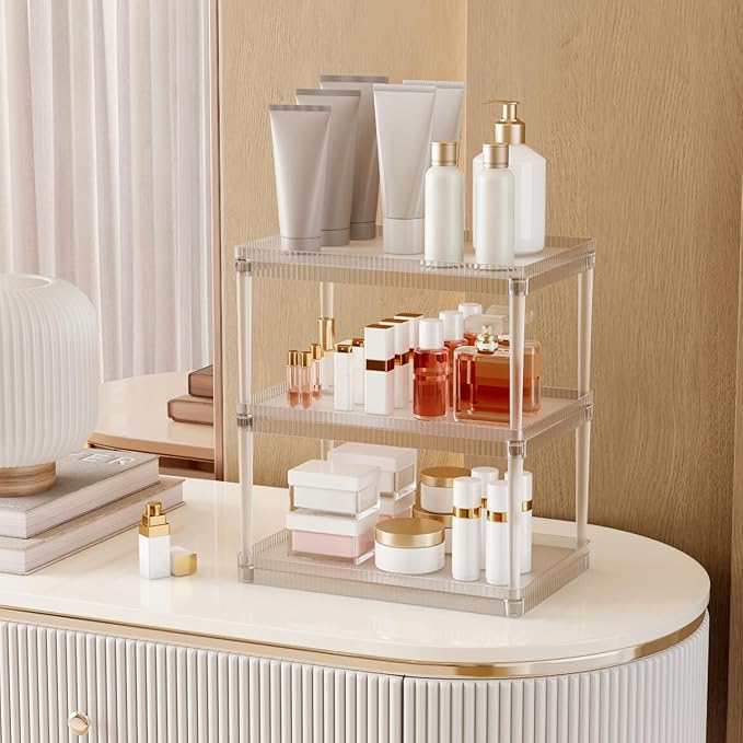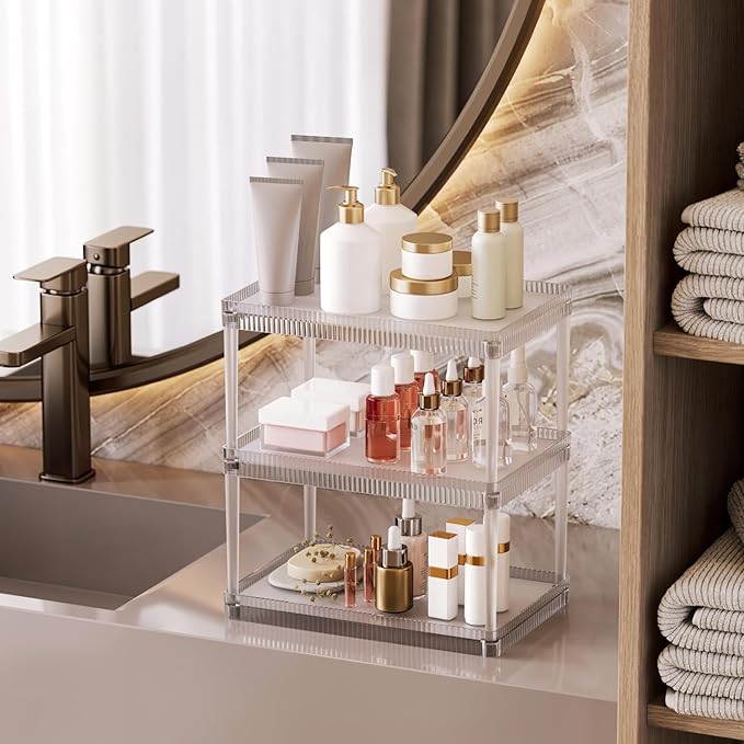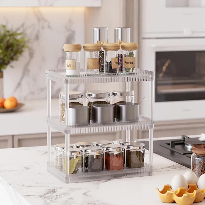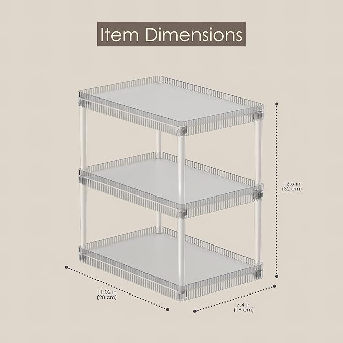3-Tier Makeup Cosmetic Organizer Shelf Multifunctional Vanity Storage Rack for Cosmetics, Skincare, Beauty Products, Spice Organizer Shelf for Bathroom, Bedroom, Kitchen, Frosted Clear