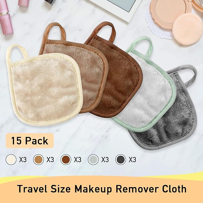 Makeup Remover Cloth, 15-Pack Soft Microfiber Face Towels for Washing Face, 5" x 5" Eye Makeup Remover Pads, Travel-Friendly Makeup Remover Wipes, Gentle Wash Cloths for Sensitive Skin