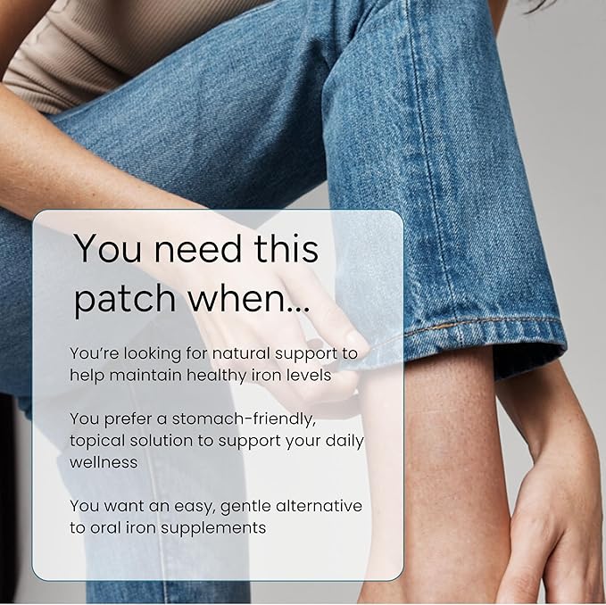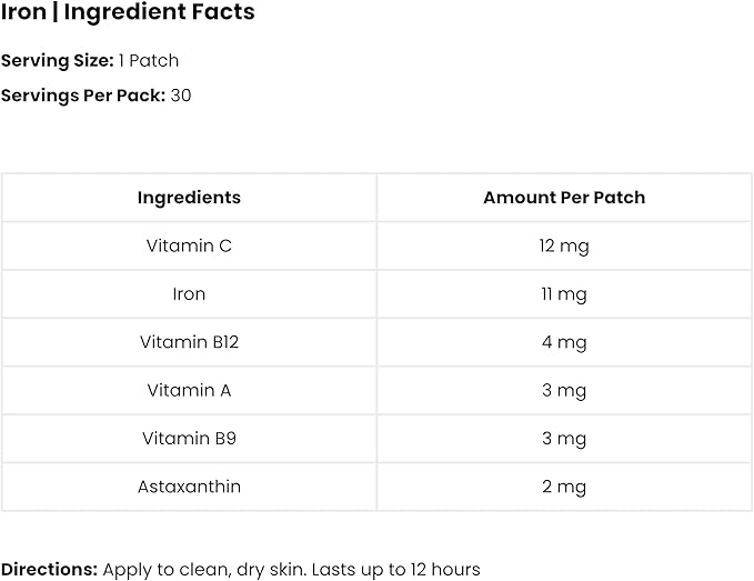 Iron Patch | Iron Bisglycinate, Vitamin C, Vitamin B9 (Methylfolate), Vitamin B12, Beta-Carotene, Astaxanthin | 30 Patches
