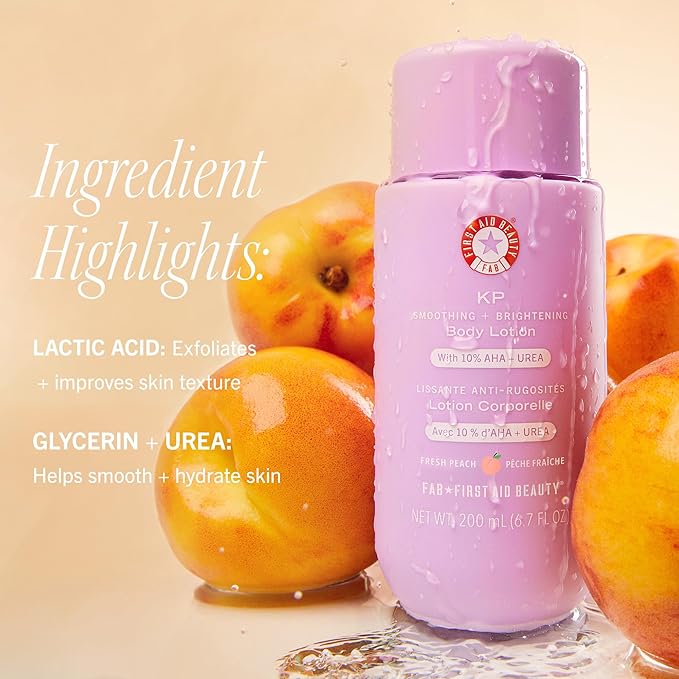 First Aid Beauty - KP Smoothing + Brightening Body Lotion with 10% AHA, Lactic Acid, Urea + Colloidal Oatmeal, Exfoliate + Moisturize, Banish Keratosis Pilaris Bumps, NEW Peach Scent (6. 7 fl oz)