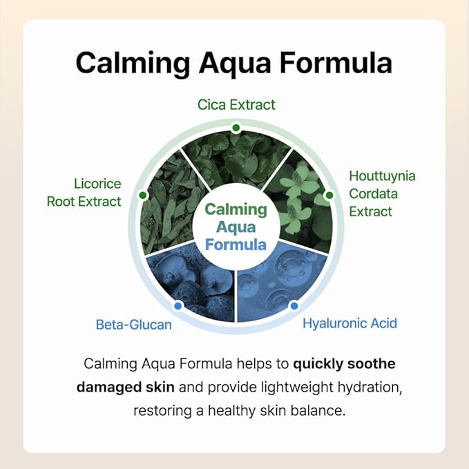 - Calming Aqua Formula: Enriched with soothing botanical ingredients like Centella Asiatica, Licorice Root, and Houttuynia Cordata to deliver hydration while calming the look of redness
