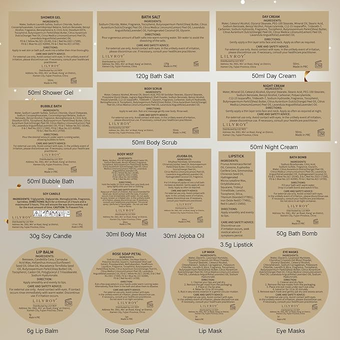 • 25Pcs Happy Birthday Gifts for Women Mom: 50ml Shower Gel, 50ml Bubble Bath, 50ml Day Cream, 50ml Night Cream, 50ml Body Scrub, 30ml Jojoba Oil, 30ml Body Mist, 120g Bath Salt, 50g Birthday Fizzer, 30g Birthday Candle, Eye Masks, Lip Mask, Lip Balm, Lipstick, Keychain, Necklece, Bath Towel, Key Bottle Opener, Massager Comb, Silk Sleep Mask, Nail Clippers, Bath Sponge, 5g Dry Flower, Soap Flower packaged in a nice beautiful Paper Gift Box. The birthday spa gift sets for women offer the most luxurious and perfect bath experience