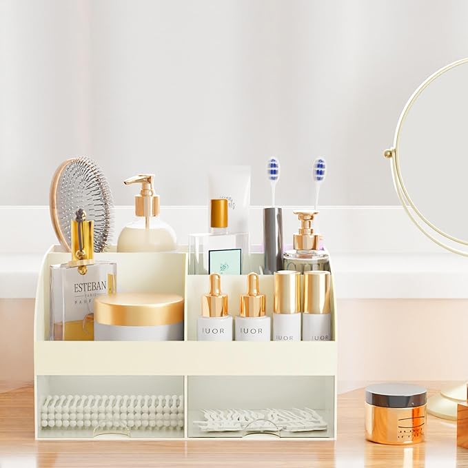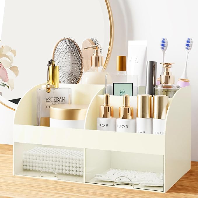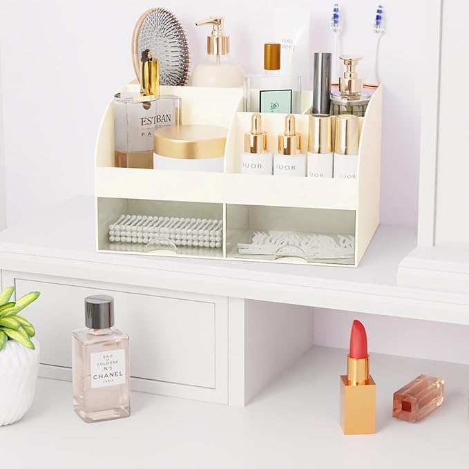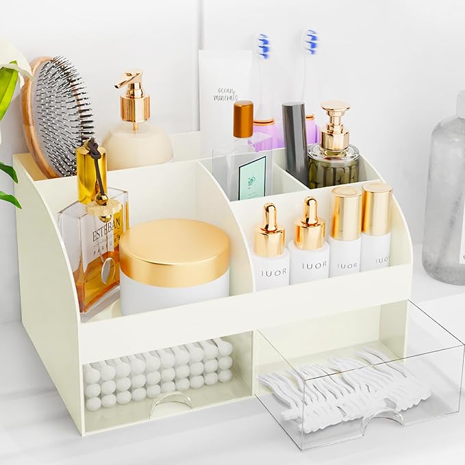 Makeup Organizer with Drawers, Cosmetic Storage for Dresser Vanity and Bathroom Countertop, Beauty Holder for Lipstick Brush, Skincare Organizer for Vanity, Cosmetic Display Case (Ivory)