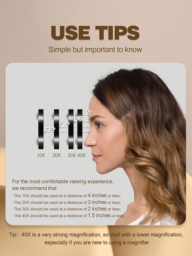 • 40X magnifying mirror has the highest magnification power on the market. In order to achieve clear visibility, it must be used in extremely close proximity within 1.5 inches. Careful selection is therefore required, preferably starting with lower magnification levels