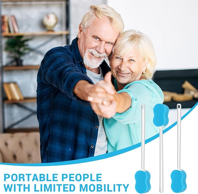 3 Pcs Long Handle Bath Sponge 22.4'' Back Sponge on a Stick Lightweight Back Washer Handled Butt Scrubber Shower Brush for Foot Body Cleaning Bathing Limited Motion (Blue)