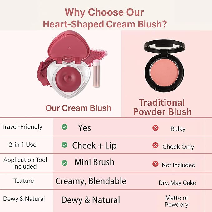 - πΈ Smooth, Creamy & Blendable β Easy to apply with fingertips or the included brush. The richly pigmented cream melts into skin for a natural-looking flush with a dewy, radiant finish.