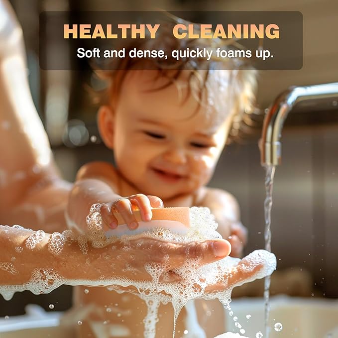 - On one side, the sponge features a soft, cushiony foam that’s perfect for washing your baby from head to toe, including delicate areas like their face. The other side includes soft bristles for added care and comfort during bath time.