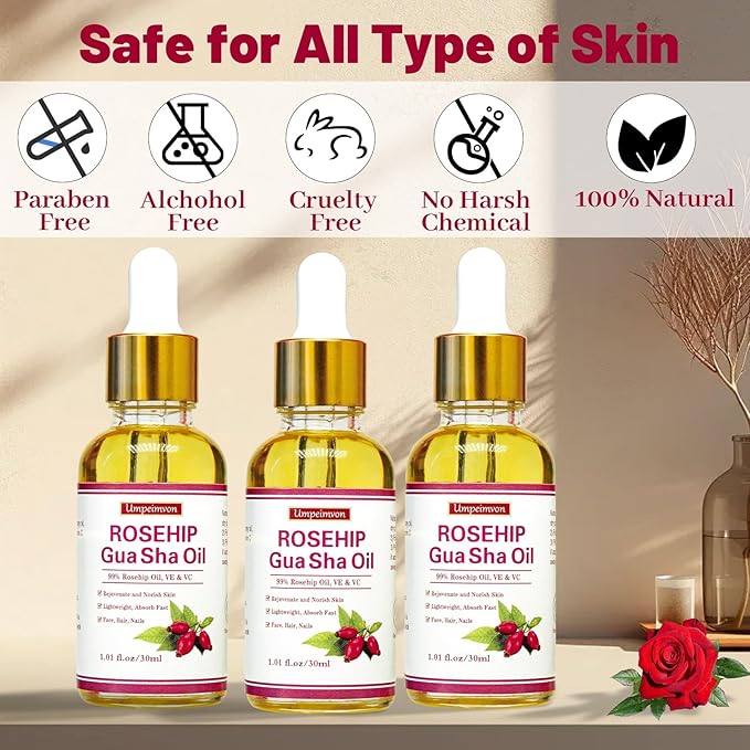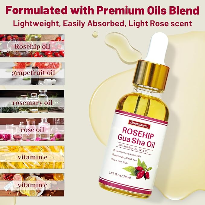 - 99% Rosehip Oil Infused: The ordinary rosehip oil in this gua sha face oil hydrates without clogging pores, helps with redness, scar and fine lines. This guasha oil additionally infused grapefruit oil, rosemary oil, rose oil and vitamin E & C, giving skin more care of moisturizing and nourishing.