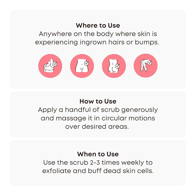 - How to Use: The scrub is best used in the shower with wet skin. Once you are done cleaning your body, take a small handful of scrub and rub it on your skin in a circular motion. You can use the exfoliating scrub all over your body, focusing on your bikini line, legs, underarms, tush, and other sensitive areas. When to Use: we recommend using this scrub 2-3 times a week in the shower. Before shaving, getting a wax, or having sugar hair removal, follow with one of our ingrown hair oils for best results, (sold separately).
