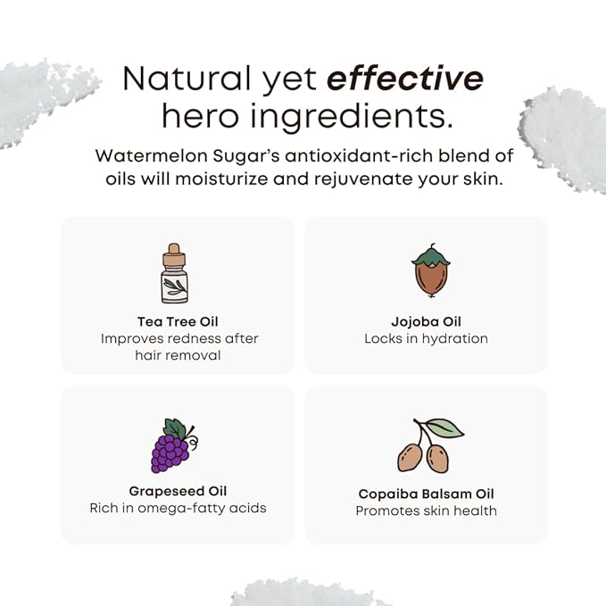 - How Watermelon Sugar Scrub Works: An exfoliating body scrub formulated with sugar and a hydrating blend of mixed oils like jojoba seed, tea tree, and grapeseed that leaves skin hydrated and soft while reducing the appearance of ingrown hair and razor bumps via exfoliation. For External Use Only.