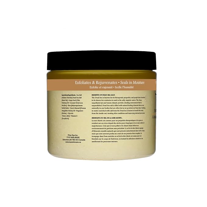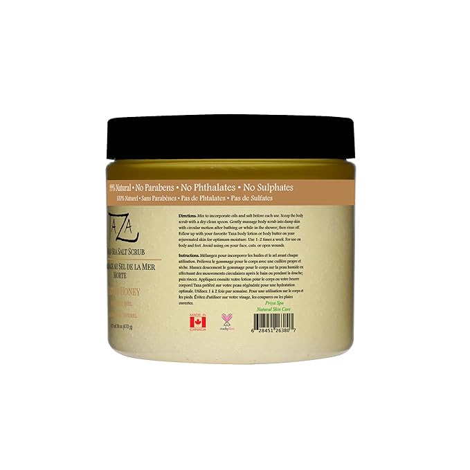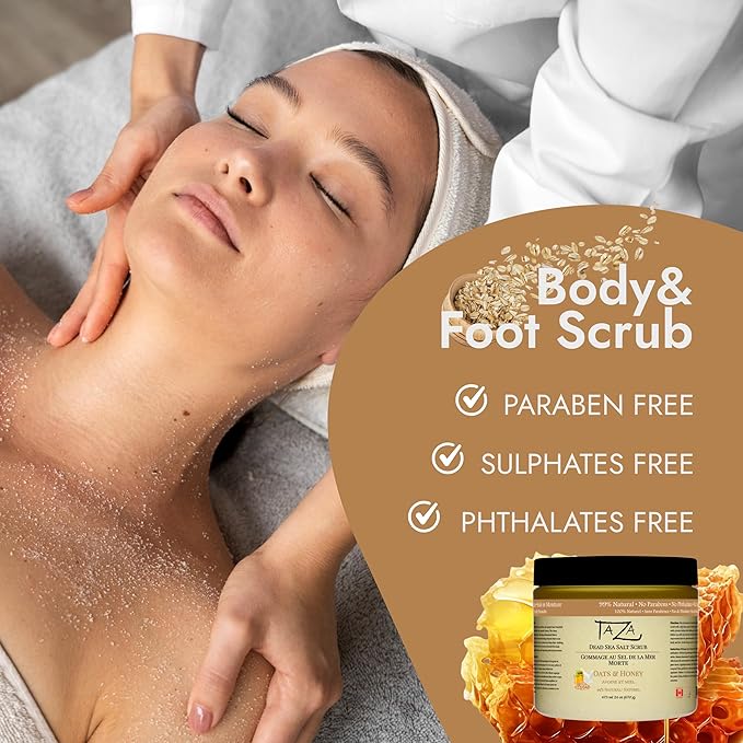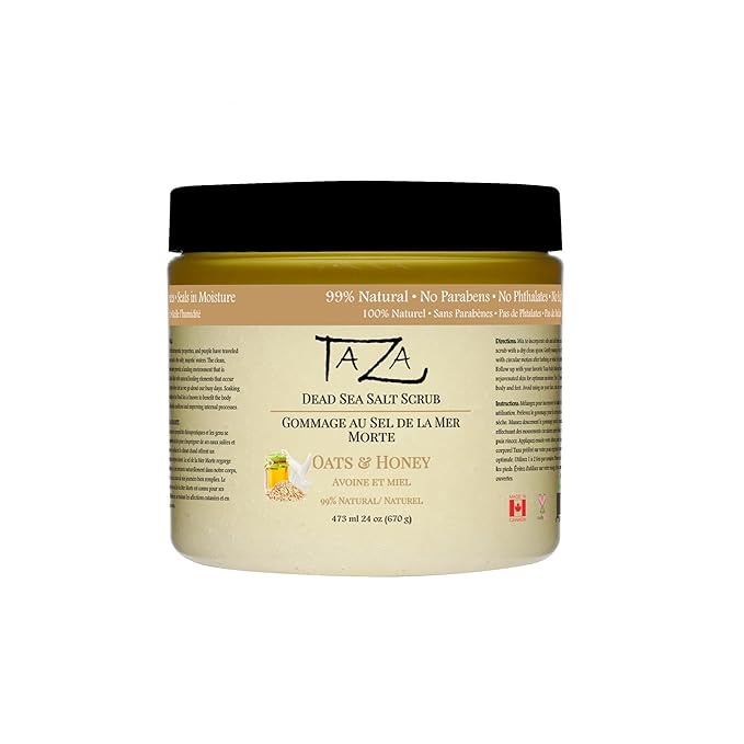 Premium Taza Oats and Honey Dead Sea Salt Scrub, 473 ml 24 oz (670 g) Exfoliates Your Skin Leaving it Soft and Hydrated Contains: Coconut Oil, Shea Butter, Grapeseed Oil, Sweet Almond Oil, 26 Minerals