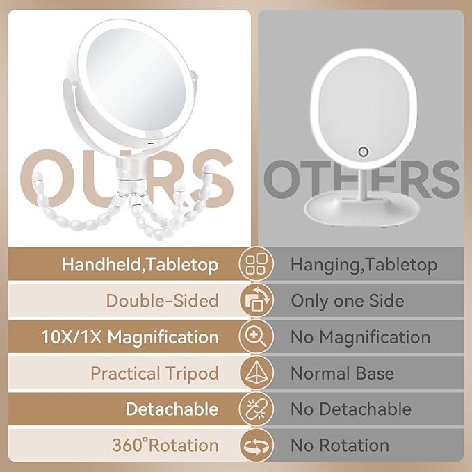 • 10X/1X Dual-Sided Magnifying Mirror with Light:Ideal for eyelash extensions and precision grooming, the 10X side reveals pore-level details (keep eyes within 4"), while the 1X side handles daily makeup. No more switching between multiple mirrors!