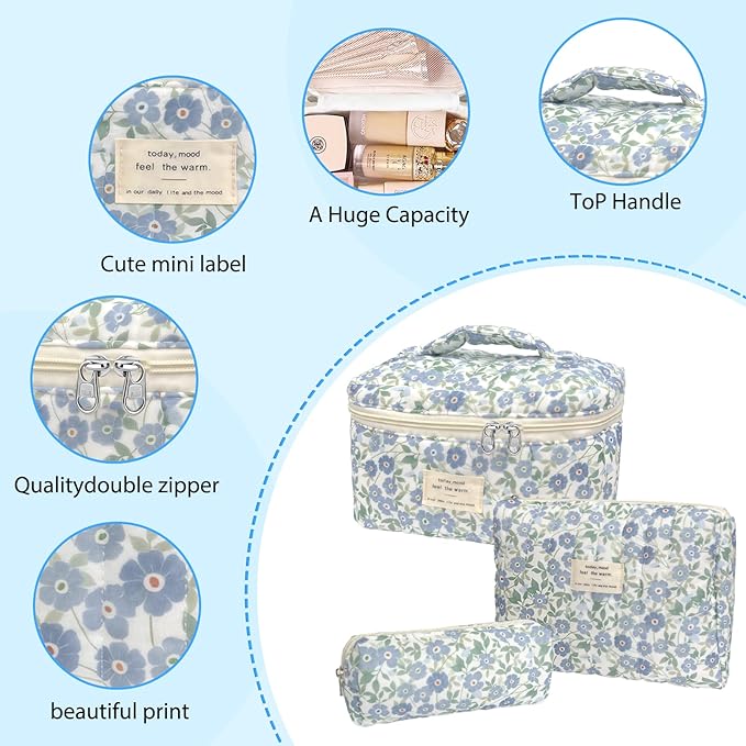 3 Piece Blue Cute Floral Cotton Quilted Makeup Bag Set, Large Capacity Travel Makeup Bags for Women and Girls, Includes Small, Medium, and Extra Large aesthetic makeup&Cosmetic Bags (3pcs-DitsyFloral)
