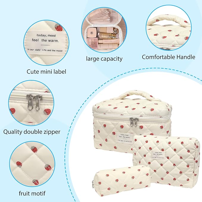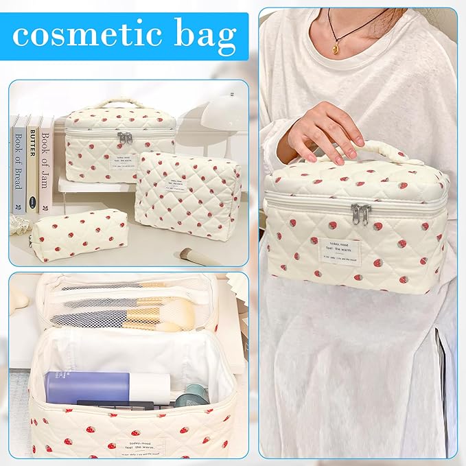 3 Piece Strawberry Quilted Makeup Bag, Large Capacity Travel Cosmetic Bag for Women and Girls, Aesthetic Storage for Daily and Travel Use (3pcs-Strawberry)