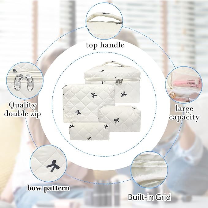 4 Piece Cute Bow Embroidered Quilted Makeup Bag Set, Large Capacity Travel Makeup Bags for Women and Girls, Includes Small, Small-Medium,Medium, and Extra Large aesthetic makeup&Cosmetic Bags