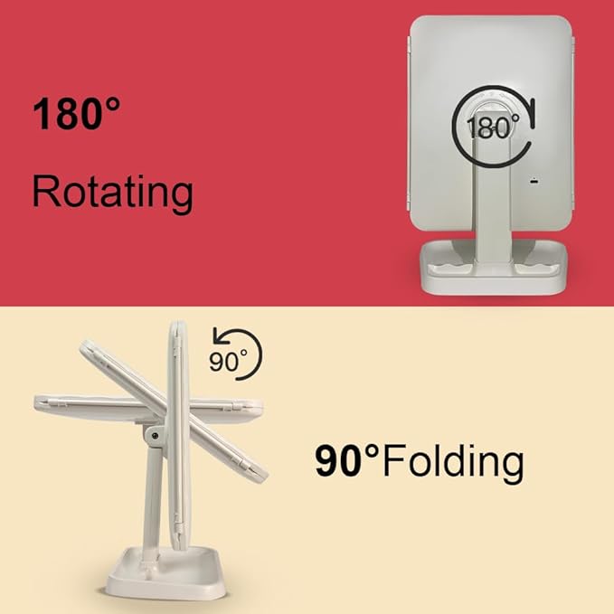 - 【Space-Saving Foldable Design】-Fold the base 90° for compact storage or rotate the mirror 180° for optimal angles. Fits perfectly on cluttered vanities, desks, or in luggage—no more sacrificing space for beauty!