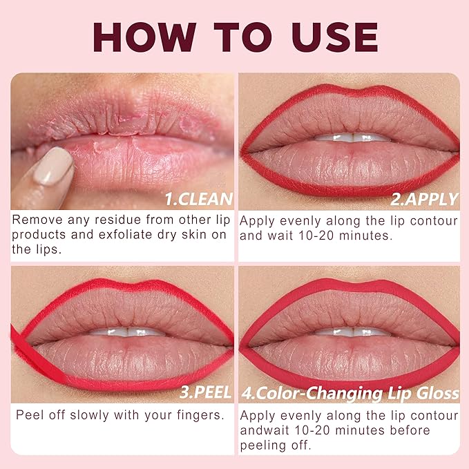 - Easy-to-Use Peel Off Formula – Apply the lip stain peel off, let it set for 10–20 minutes, then peel off to reveal a matte, natural finish that enhances your lips.