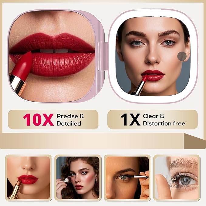 Adjustable Brightness Compact Mirror, Lighted Travel Mirror with 1X/10X Magnifying,Double Sided,Mini Dimmable Portable for Handbag and Pocket, USB C Charging,for Girls Women(Pink)