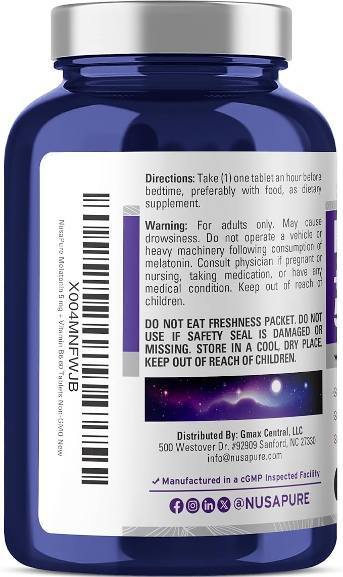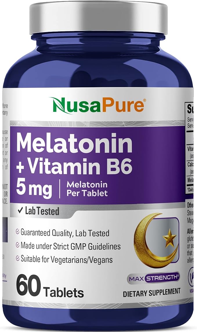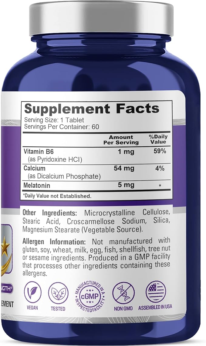 - Melatonin + Vitamin B6 5 mg 60 Tablets Vegetarian/Vegan, Non-GMO