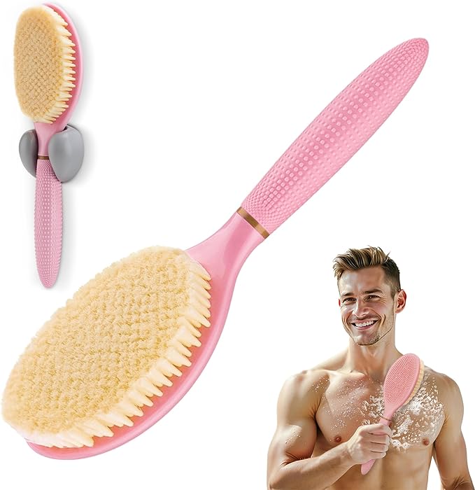 New Body Brush for Wet or Dry Brushing, Anti-Slip Corn-Handle Shower Brush with Large Dual-Side Head & Soft Bristles, Easy-to-use Bath Brushes for Lathering Cleansing(Pink-S)