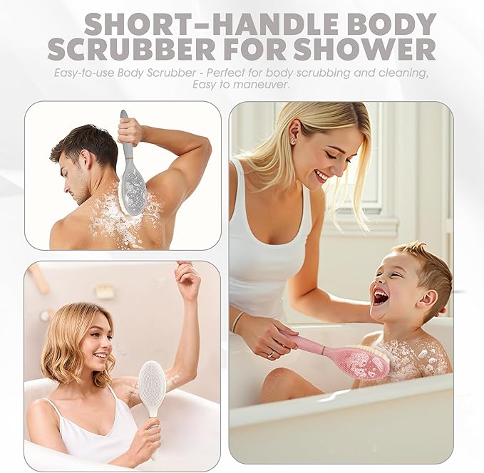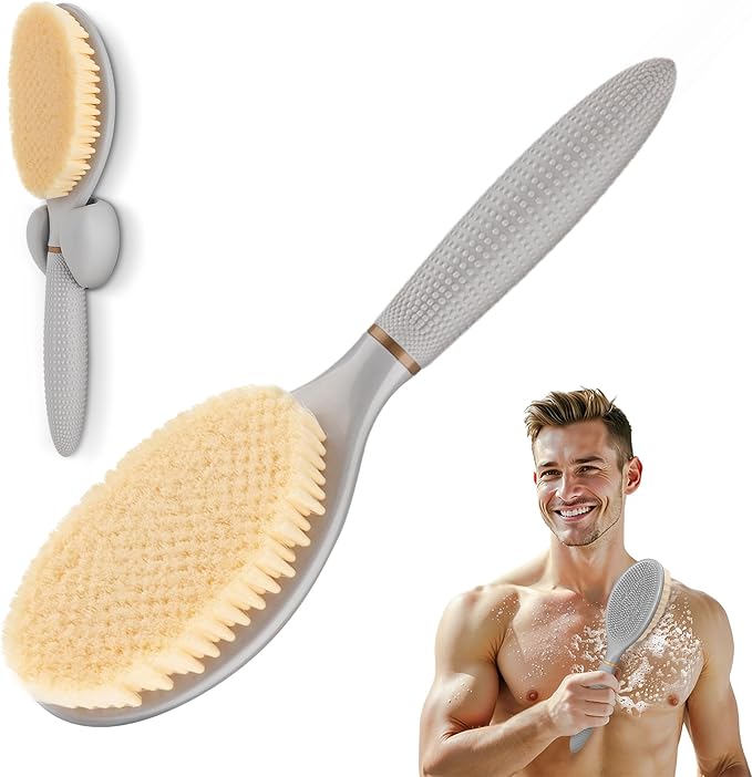 New Body Scrubber for Wet or Dry Brushing, Anti-Slip Corn-Handle Shower Brush with Large Dual-Side Head & Soft Bristles, Easy-to-use Bath Brushes for Lathering Cleansing(Gray-S)