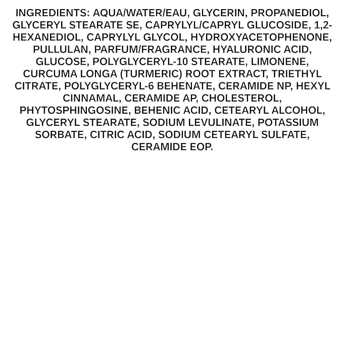 - Enriched with Ceramides, Glycerin, Low Molecular Weight Hyaluronic Acid, and Turmeric Root to hydrate, strengthen and restore the skinβs barrier for the look of nourished, plump skin