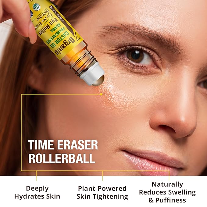 Seven Minerals Castor Oil Roll On Eye Roller for Under Eye Bags, Dark Circles & Wrinkles - Powerful Organic Blend of Castor, Frankincense & Jojoba - Brighten, and Revitalize Skin & Face - 0.33 fl oz