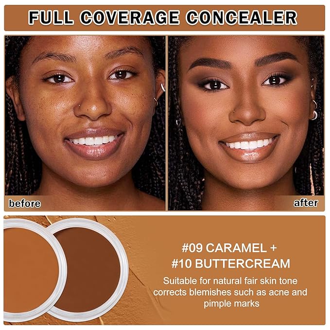 2PCS Under Eye Concealer for Dark Circles Color Correcting,Pro Concealer Full Coverage Tattoo Cover up Makeup,Long-lasting Corrector de Ojeras (09 Caramel+10 Buttercream)