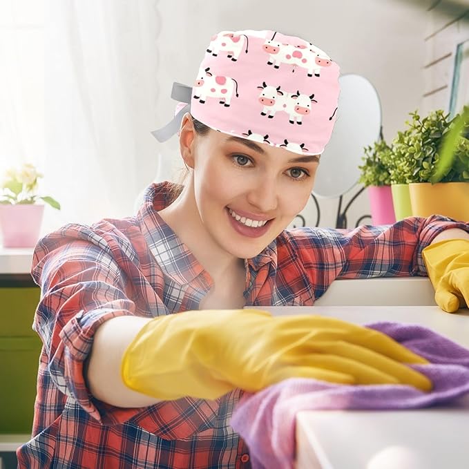 2 PCS Bouffant Cap with Button Ponytail Pouch Working Cap Sweatband Adjustable Surgical Cap Black and White Cow