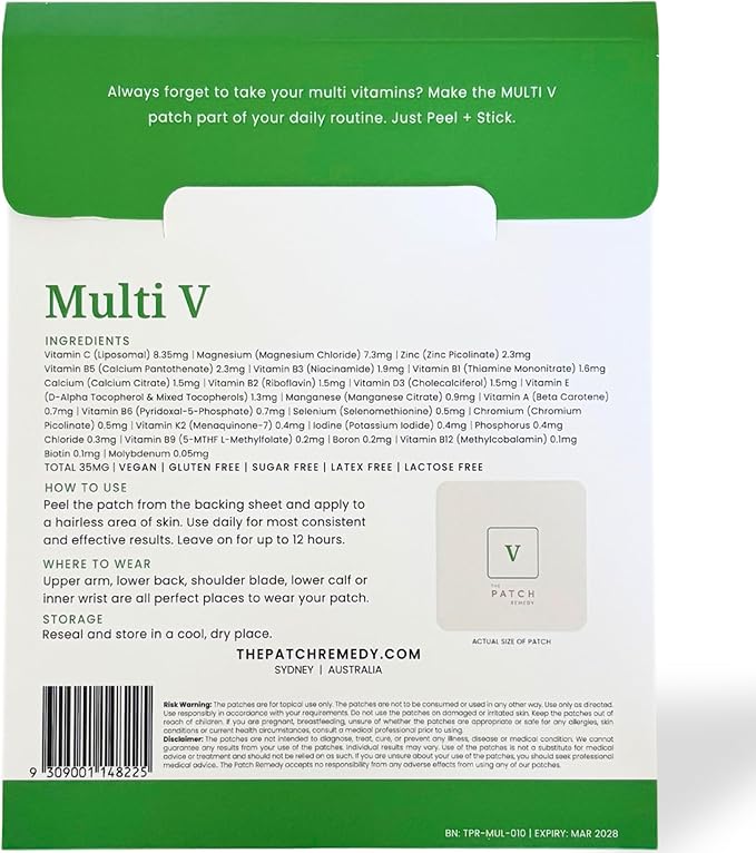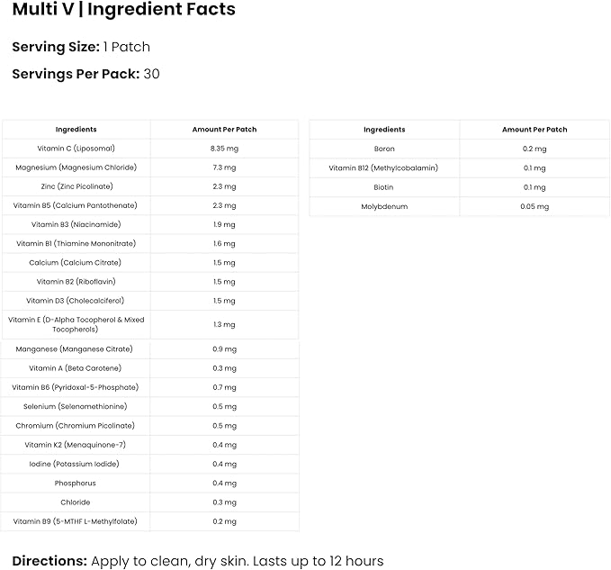 Multi V Patches - Topical Multi Plus Blend with D3, K2, Magnesium Chloride, Zinc, Liposomal C, Potassium, Iodide, Biotin Plus More | Nutrient Patch for Women & Men