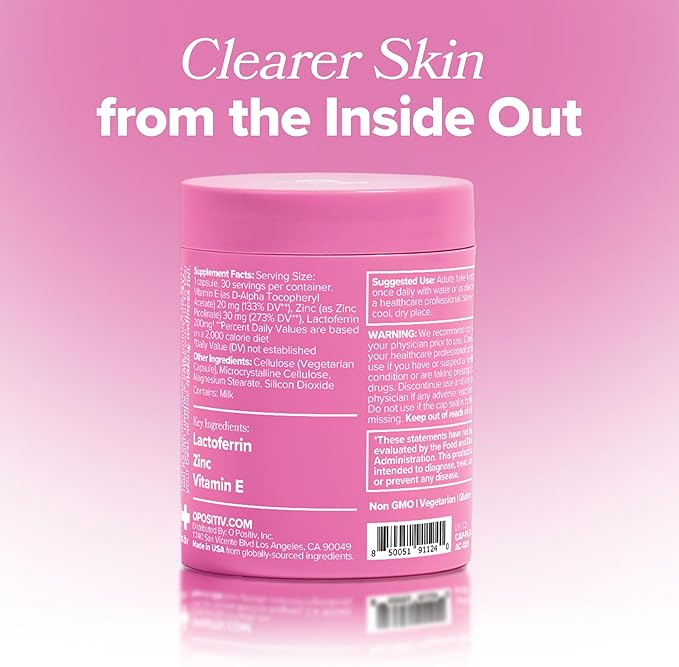 O Positiv FLO Acne Capsules β Reduce Number and Severity of Pimples, Whiteheads, Blackheads, and Pustules on Face, Back, and Body β Colostrum-Derived Lactoferrin, Zinc and Vitamin E β 30 Servings