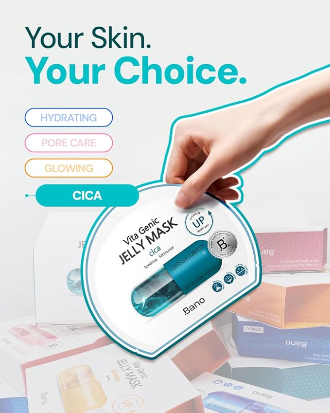 Bano Vita Genic Jelly Face CICA Mask 10EA – Soothing & Hydrating Sheet Mask for Sensitive Skin, Korean Glass Skin Care with Centella, Vitamin C, Biotin & Niacinamide, Fragrance-Free