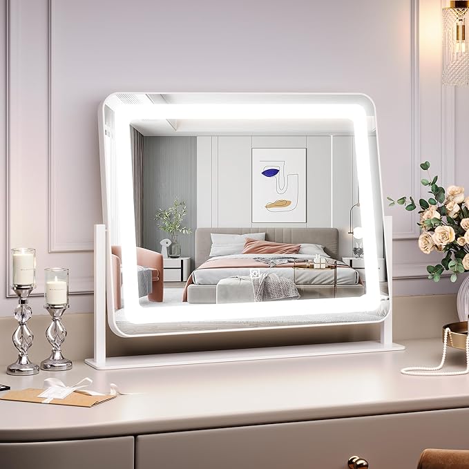 19.6"x15.7" Vanity Mirror with Lights, Large Lighted Mirror, LED Makeup Mirror with 3-Color Dimmable Modes and Smart Touch Control, Perfect for Desk or Bedroom, Vanity Desk Tabletop Makeup, White