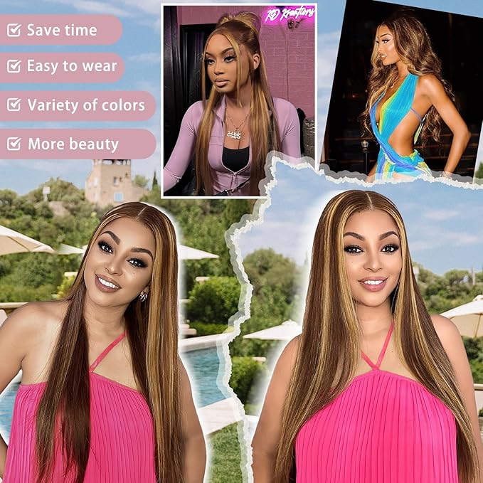 Highlight Human Hair Wigs Balayage Brown Highlight 7X5 Lace Front Bye Bye Knots Glueless Wigs Human Hair Pre Plucked Pre Cut Bleached Knots Pre Everything Put on and Go Wig 28 inch