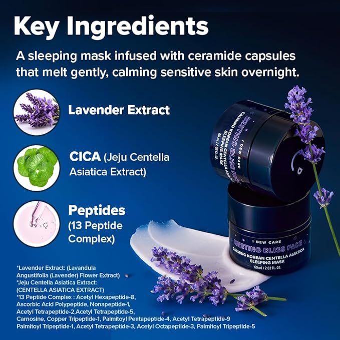 • REST & REVIVE WITH CALMING CARE: Unwind with our Resting Bliss Face Calming Sleeping Mask, infused with Korean Lavender Extract, CICA (Jeju Centella Asiatica Extract) + Peptides (13 Peptide Complex) to soothe and nurture skin for a calm, balanced complexion by morning. *13 Peptide Complex : Acetyl Hexapeptide-8, Ascorbic Acid Polypeptide, Nonapeptide-1, Acetyl Tetrapeptide-2, Acetyl Tetrapeptide-5, Carnosine, Copper Tripeptide-1, Palmitoyl Pentapeptide-4, Acetyl Tetrapeptide-9, Palmitoyl Tripeptide-1, Acetyl Tetrapeptide-3, Acetyl Octapeptide-3, Palmitoyl Tripeptide-5.