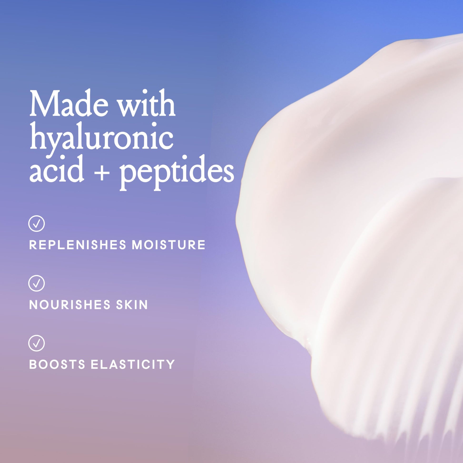 - HYALURONIC ACID + PEPTIDES: To replenish moisture and boost elasticity