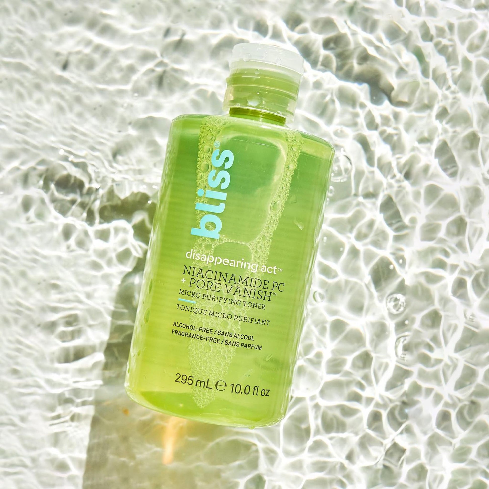 - DISAPPEARING ACT NIACINAMIDE TONER: Use Bliss' fragrance-free facial toner to instantly minimize the look of pores while leaving skin purified and refreshed
