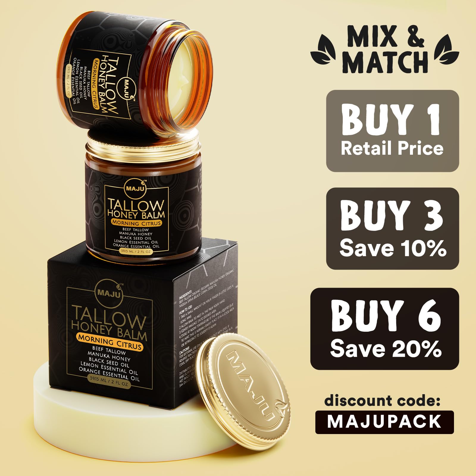 - Grass Fed & Finished Tallow Face Moisturizer: Wake up your skin with a non-toxic skincare routine using MAJU's Morning Citrus Tallow Honey Balm. This vibrant blend is infused with uplifting lemon and orange essential oils and zero synthetic fragrances. Our tallow is non comedogenic, won't clog pores and quickly absorbs into skin for deep and lasting hydration. Our formula maximizes skin benefits with the addition of Manuka Honey from New Zealand and organic cold pressed black seed oil for a truly elevated skincare routine.